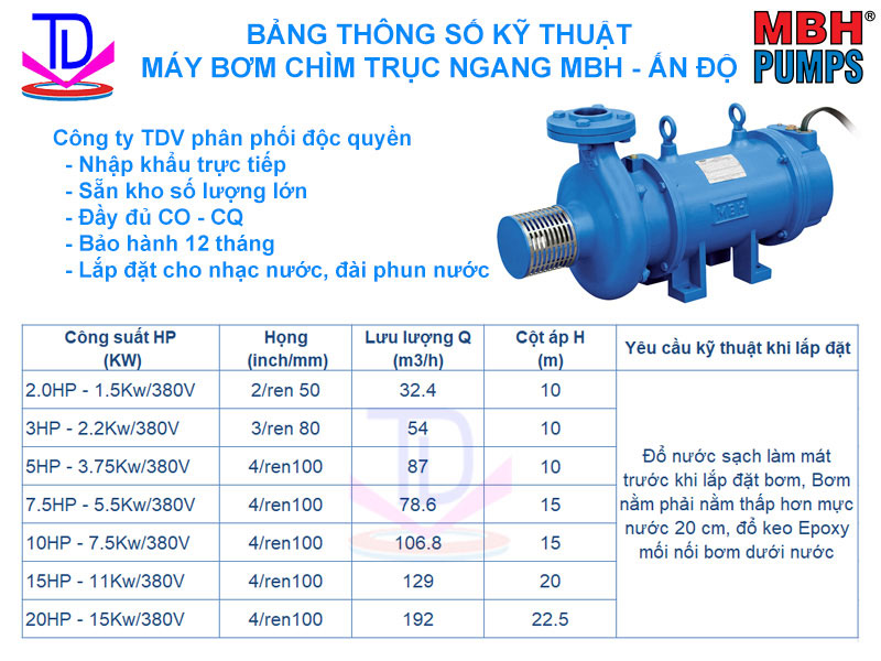 - TDV Việt Nam tự hào là đơn vị nhập khẩu và phân phối độc quyền máy bơm chìm nước thương hiệu MBH Ấn Độ. Chúng tôi cam kết bán sản phẩm chính hãng 100% với đầy đủ chứng từ chứng nhận xuất xứ, kiểm định chất lượng. Giá cả cạnh tranh nhất thị trường.